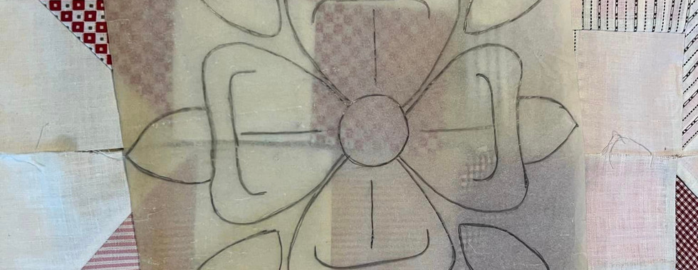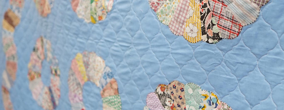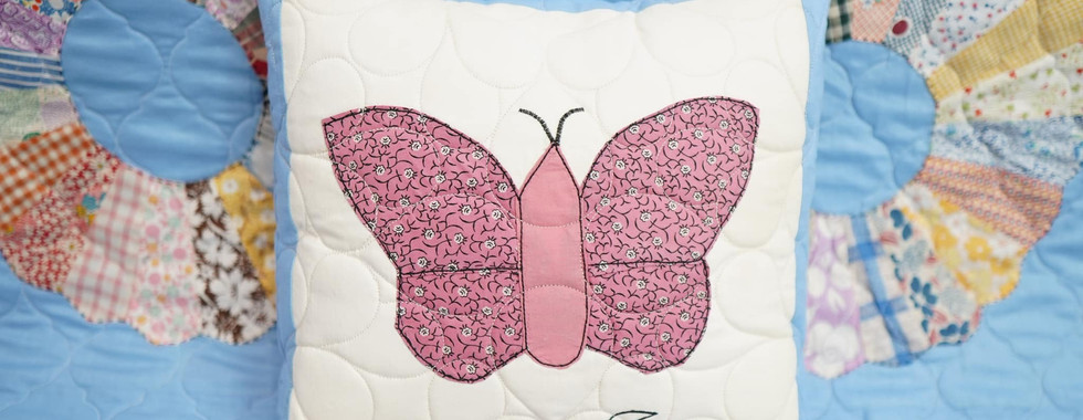 A friend of mine saw a post on a local Facebook group and got me in touch with the original poster. She was looking for someone to help finish a quilt that was started by her great-grandmother back ~1940’s. She brought a box over and we poured through some incredible bits of nostalgia. In addition to some vintage fabrics (already cut and partially pieced) there were hand-written notes, hand cut cardboard templates, old pattern pieces, even old straight pins. Figuring out what was there was like a puzzle. I began finishing the blocks that were started, figured out how they were made. The pieces were machine-stitched, but hand appliquéd to the background fabric. The partial pieces were meant for a wavy border around a very large quilt. The background fabric was all in the box cut into large strips. Great-Grandma Theresa was a gifted quilter, and by piecing together her notes, we are hypothesizing that she planned to make this quilt for Carol, her son, my customer’s grandfather. This box of treasures was handed down to her mother and then to her, and as a gift to her mother and her siblings, we completed a quilt and also put together 4 pillows with miscellaneous quilt blocks that were also found in the box along with the scraps of left over fabric.