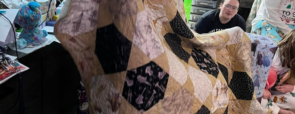 On the Sunday of the quilt retreat weekend, Tricia and I had to leave a little early so we could make it to Woodridge to take a class we had signed up for months ago. It was an AccuQuilt Club class using the hexagon and triangle dies. I had these music themed layer cakes in my stash for 2 years and brought them along knowing I needed 60 10” squares to work with. We made a stop at Quilting in the Valley during our weekend and I got some coordinating fabric for the background triangles and the pretty backing fabric.