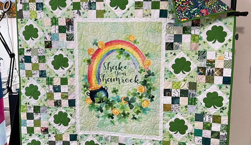Shamrock Quilt by Mimi 56”x64” (no pattern) Panel - Celebrate the Seasons March by Hoffman Quilting - Ajoure’ from Urban Elementz Signature thread (Lime) Bobbin thread - Magna-glide by FilTec (Linen) Backing fabric - Hide and Seek by Sally Kelly for Windham Fabrics